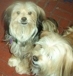 Dallas and Freddie are siblings, from the same litter, but she didn’t “breed true” — either that, or something fishy went on in the gene pool.  Dallas has snowshoe feet, but does NOT have a double coat.  One suspects that a self-respecting Tibetan Terrier breeder had a mild heart attack when they saw the two puppies side by side.  That said, Dallas is a great dog.  She loves to ride in the car, will shake hands and charm anyone she meets, and lacks any of the really bad habits that other Tibetans are prone to forming.