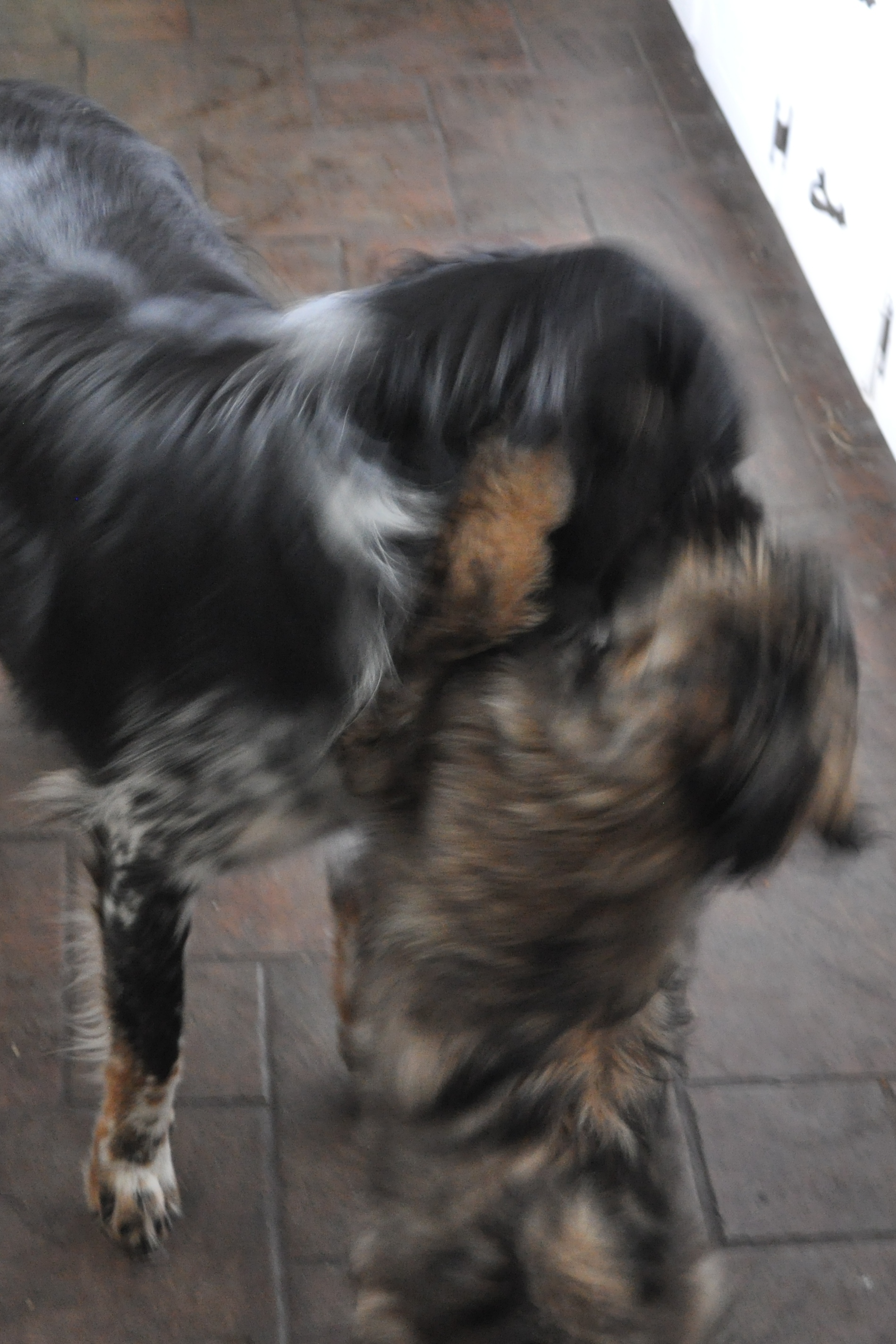 Our youngest TT, Suchi, plays rough — it’s how we got her. Two breeders who show TT’s rejected her because she did so much damage to other TT’s coats and was just “too rough”. But she is PERFECT playing with our 78-pound Irish Setter/Australian Shepherd “pound puppy” Jack. The two are inseparable. Suchi even convinced him to dig holes under the fence for her (we have video with her showing him just where to dig and nudging him on, then him standing back to let her through). We had to rework our fence line to stop THAT little partnership escapade.