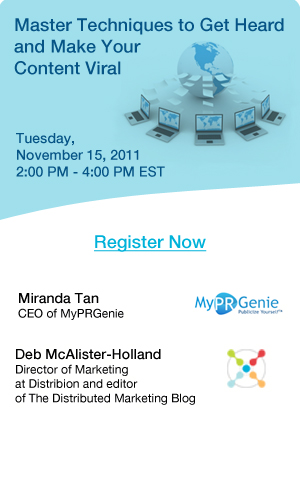 On November 15, 2011, I’ll be presenting an online master class with Miranda Tan of MyPRGenie on the tips and techniques we used to get there. I hope you’ll join us for the free webinar titled Master Techniques to Get Heard and Make Your Content Viral.