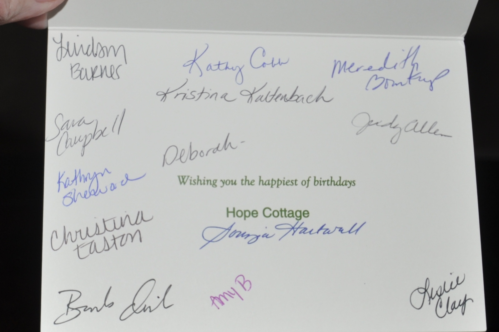 Hand-signed birthday card from strangers at Hope Cottage. Marketing tip: After someone sues you, don’t waste your time on cheery birthday greetings.