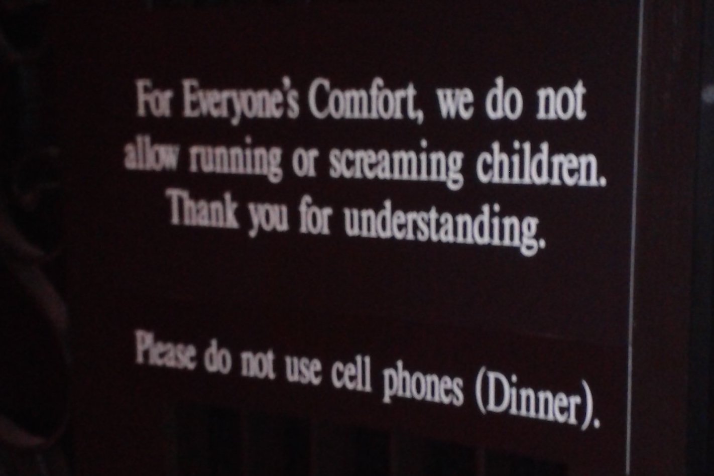I make it a point to patronize businesses like India West, a great restaurant in Addison, that put parents on notice that bad behavior won’t be tolerated.